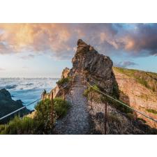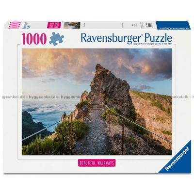 - Den smalle, stenbelagte sti fører opad mod en dramatisk klippe, der rejser sig mod himlen