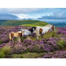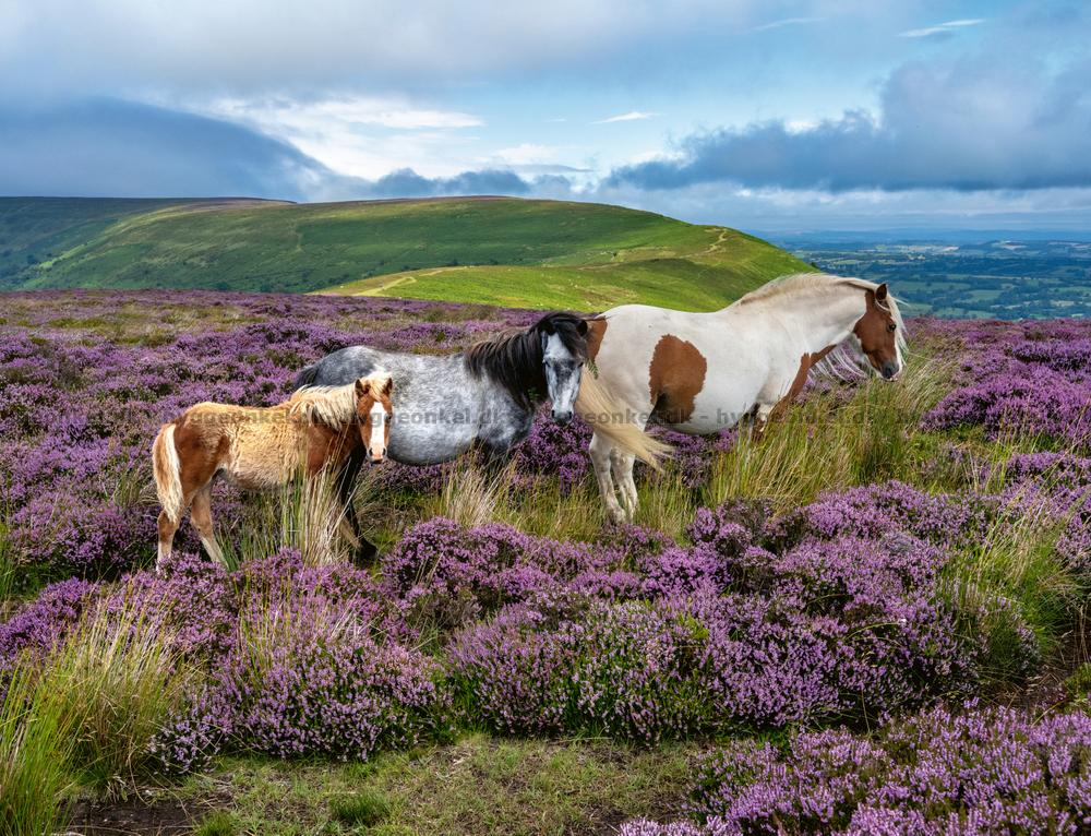 - Tre heste står fredeligt i en mark dækket af lilla lyng