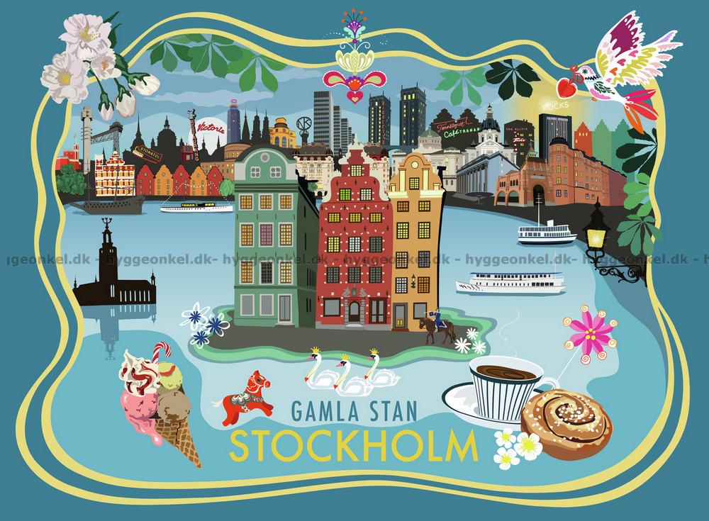 - Farverig skildring af Gamla Stan og byens ikoniske bygninger