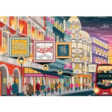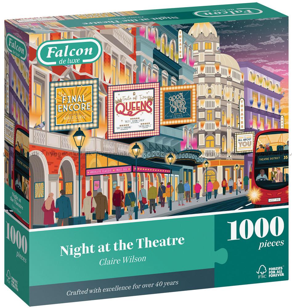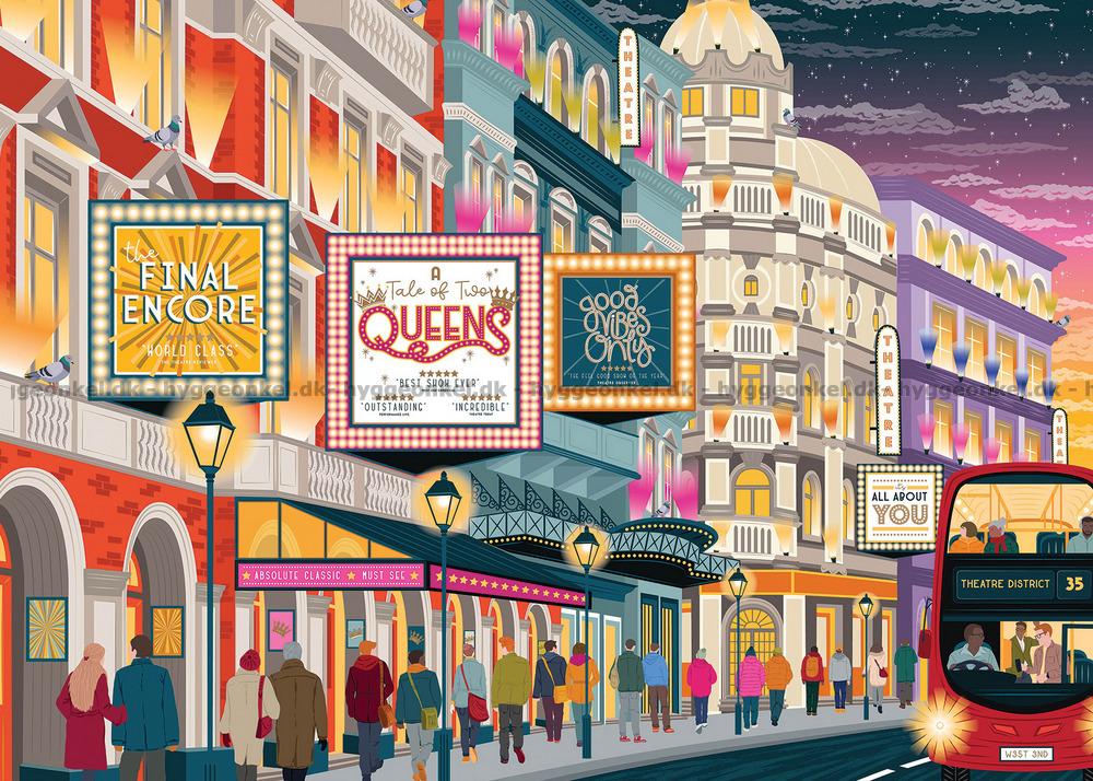 - Gaden er oplyst af farverige neonskilte og gadelygter. Folk er på vej i teateret