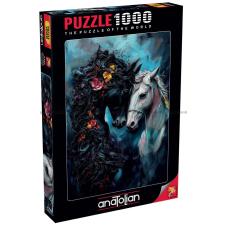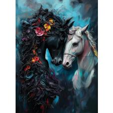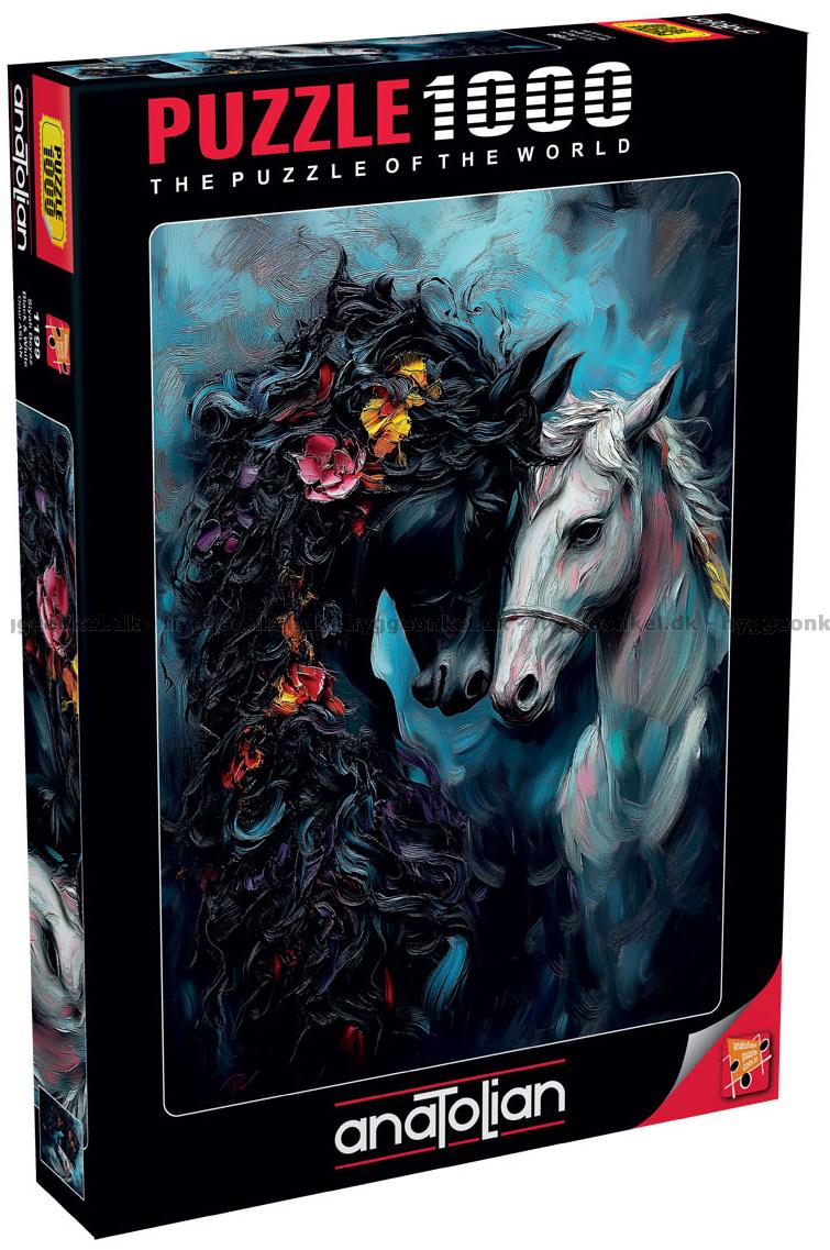 - Den ene hest er sort med en manke fyldt med blomster, mens den anden er hvid med en lysere manke
