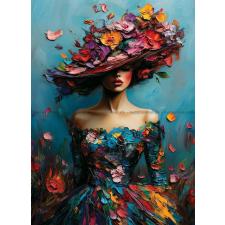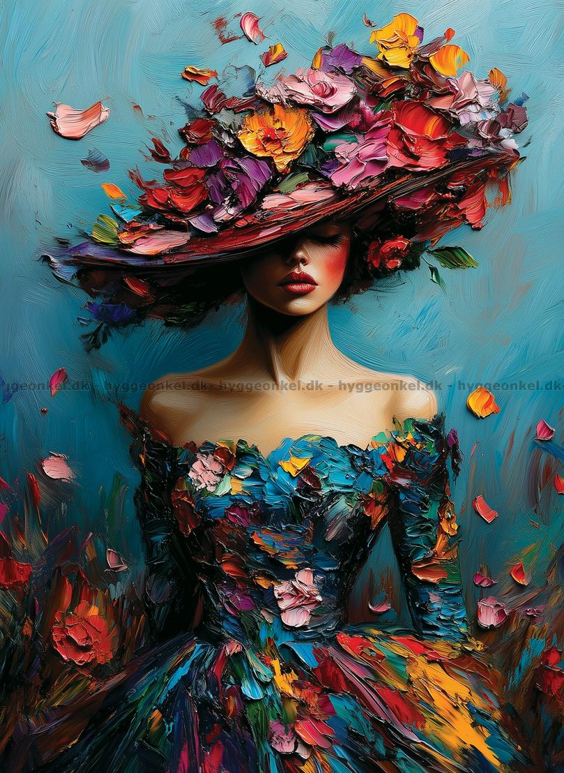- Hatten er overdådigt pyntet med blomster i forskellige farver, som ser ud til at svæve og flyde omkring hende