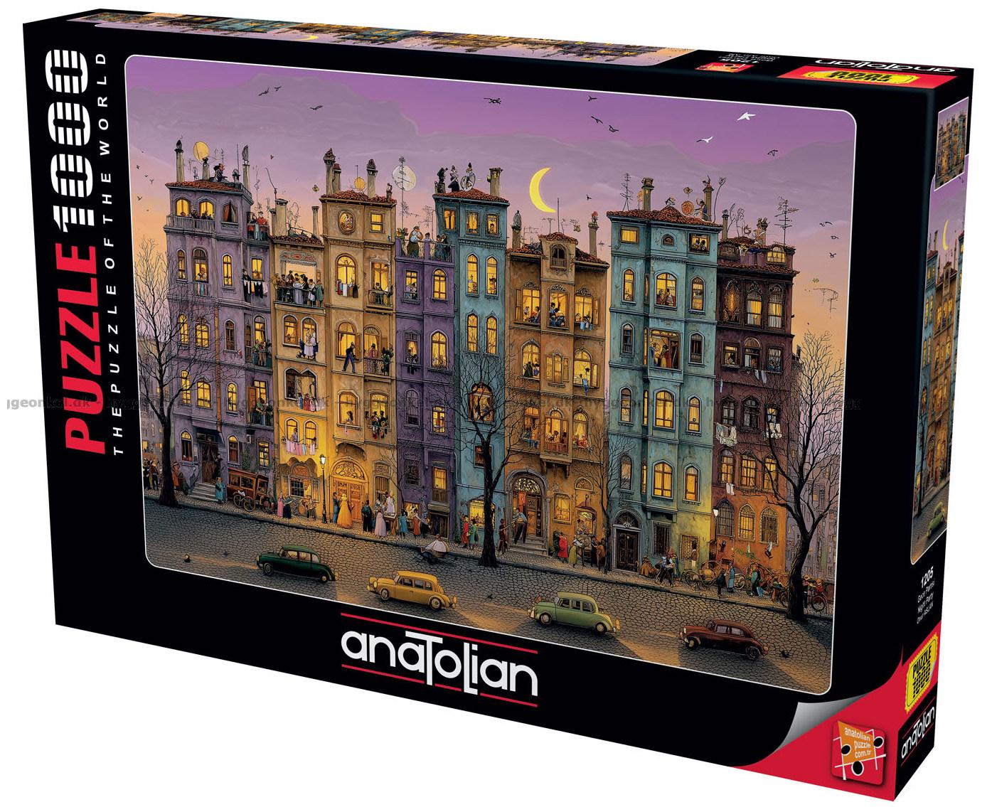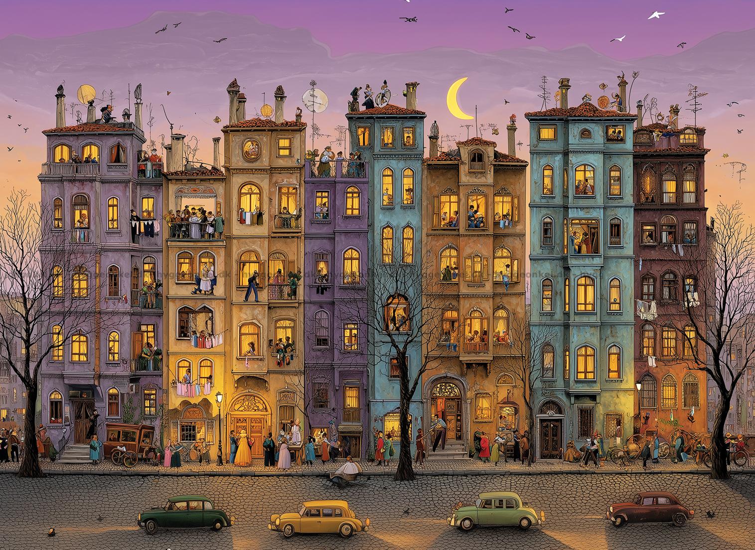 - I de farverige bygninger i byen er der liv og aktivitet i næsten alle vinduer