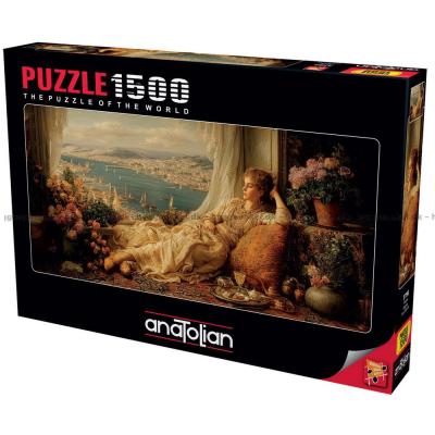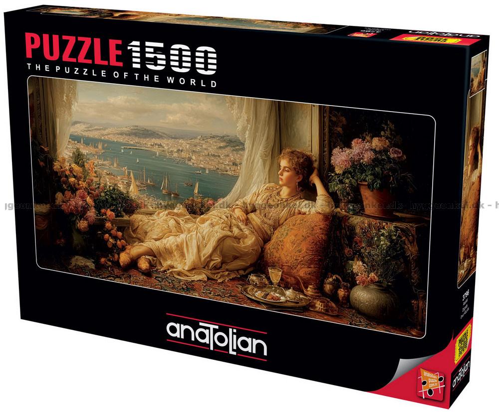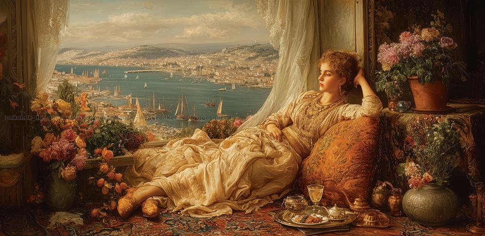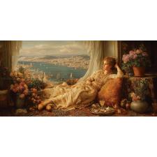 - Kvinden hviler sig i en elegant stue med udsigt over en malerisk havn. Hun er omgivet af luksuriøse puder og blomster