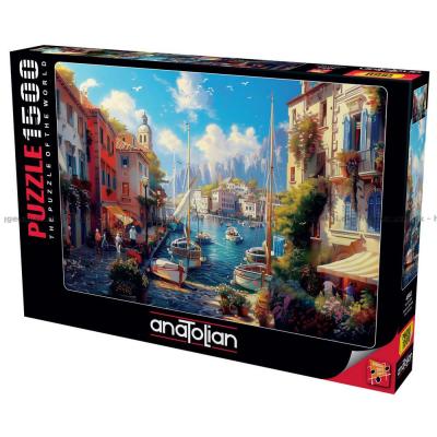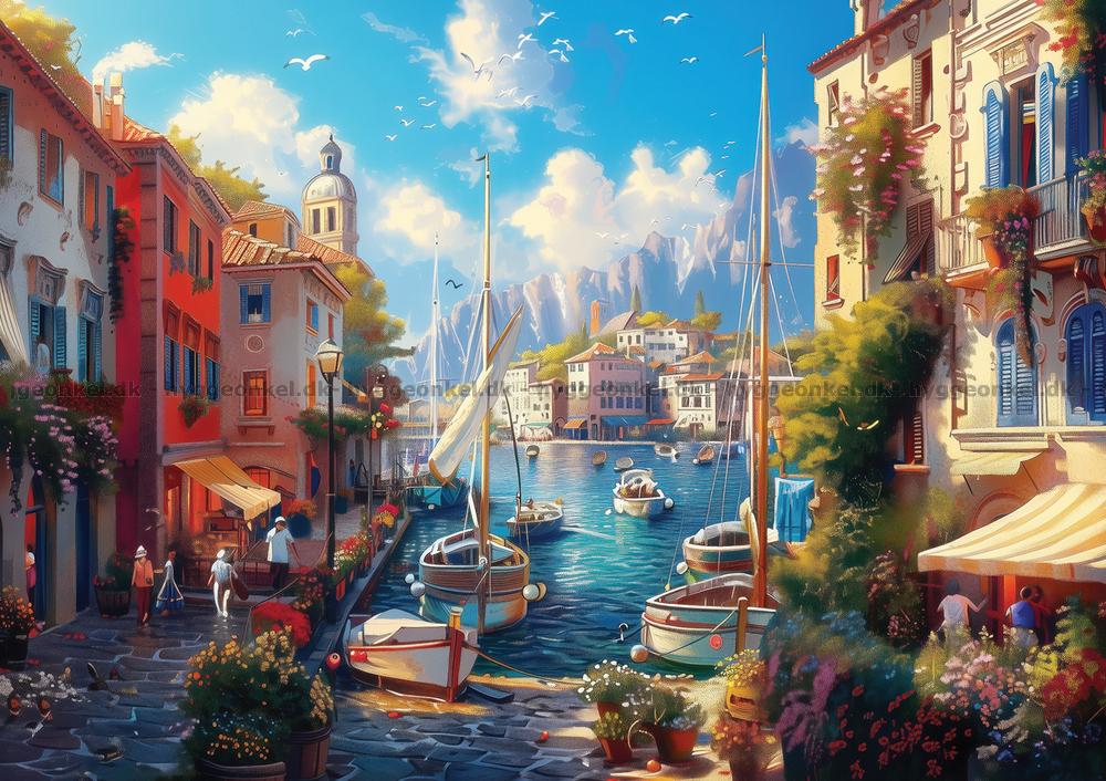 - Langs kajen ligger en række både stille i det klare, blå vand. Sejlene er hejst, og nogle både er fortøjet tæt ved de brostensbelagte gader