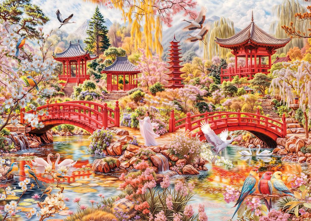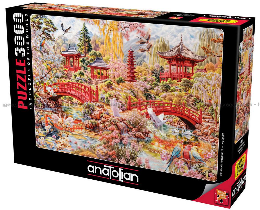 - Den smukke japanske have er fyldt med røde broer, pagoder, vand og farverige planter