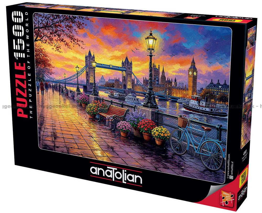 - Solnedgangen maler himlen i varme nuancer af orange, lilla og pink. Der er en hyggelig aftenstemning langs Themsen