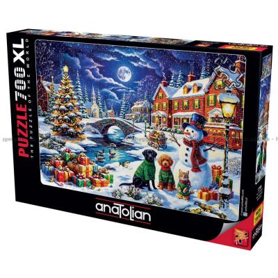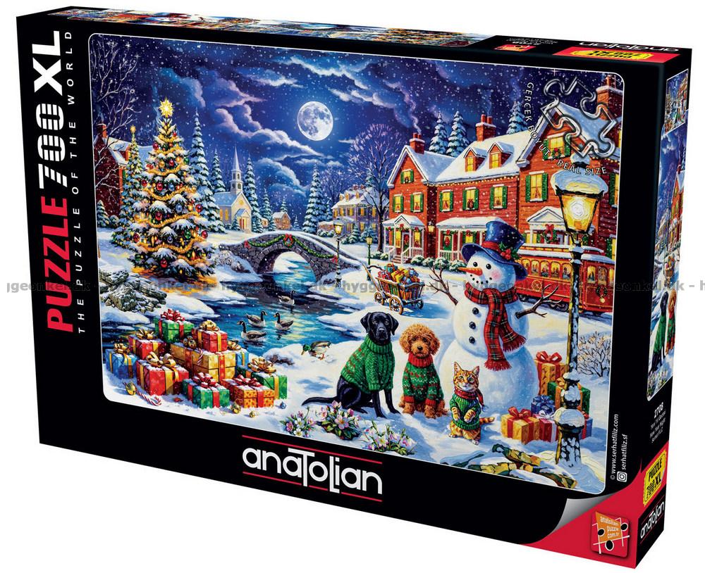 - Snemanden med det stribede halstørklæde er omgivet af herlige dyr i strikkede trøjer. Juletræet er pyntet med farverige kugler og lys. Under træet ligger en bunke af indpakkede gaver