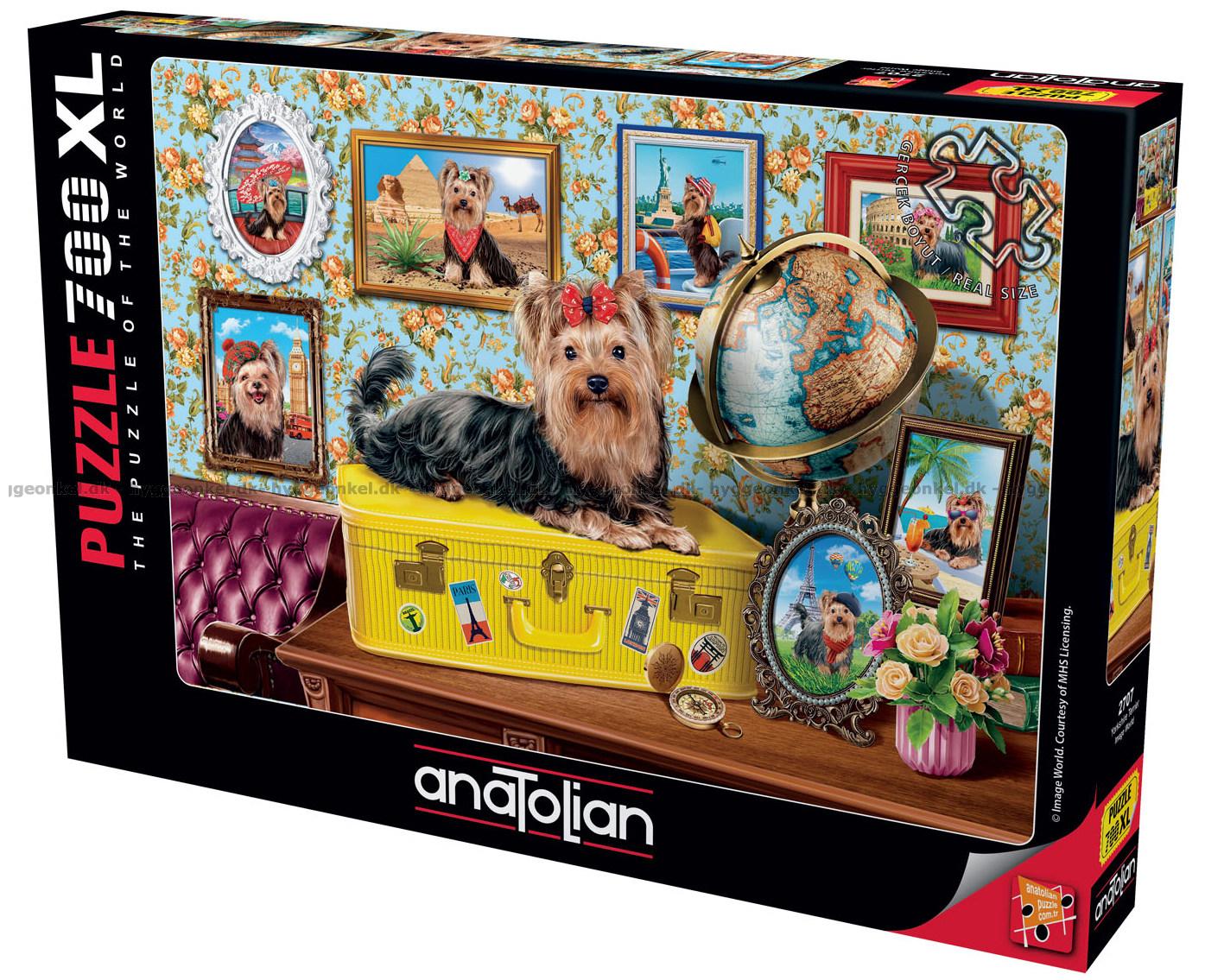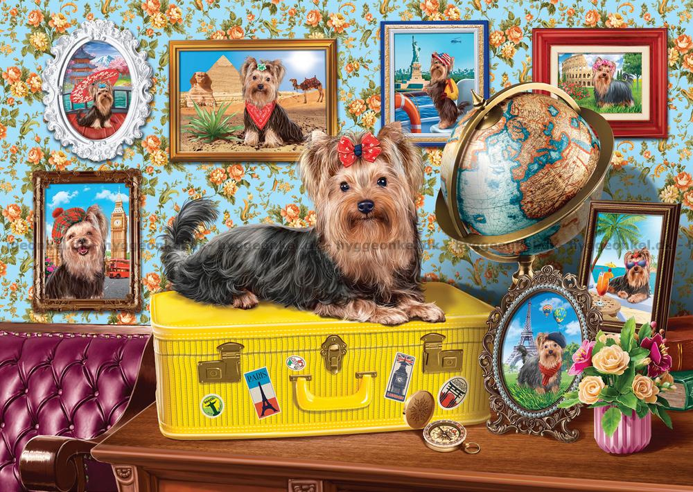 - Den charmerende Yorkshire Terrier sidder på en gul kuffert omgivet af rejseminder og billeder fra hele verden