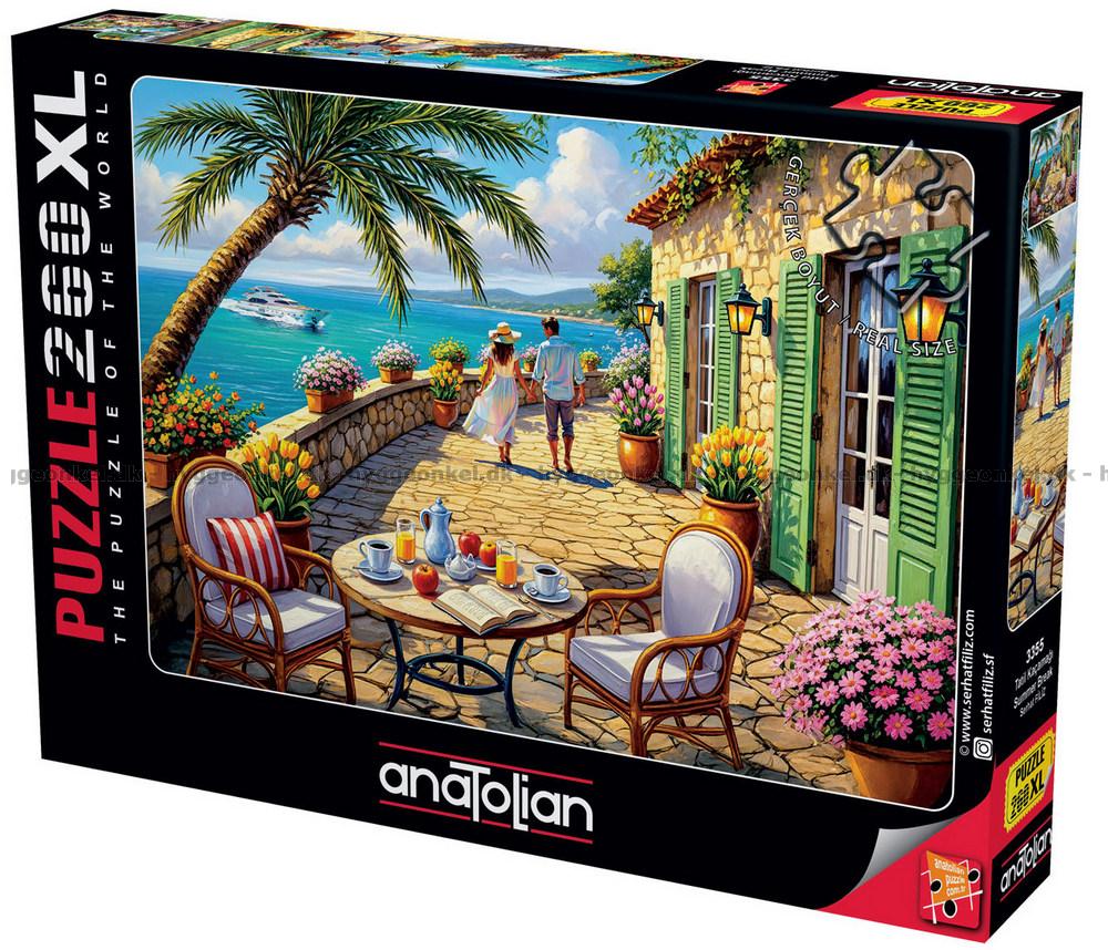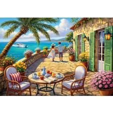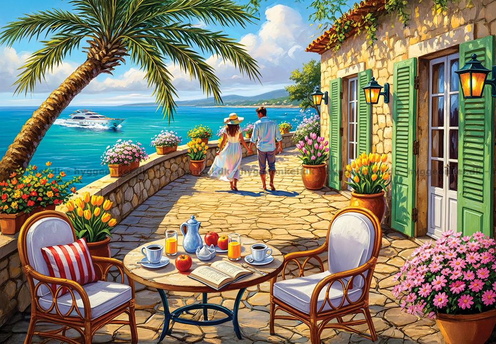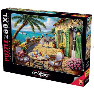 - På den solrige terrasse med udsigt til det blå hav kan man nyde sin morgenkaffe