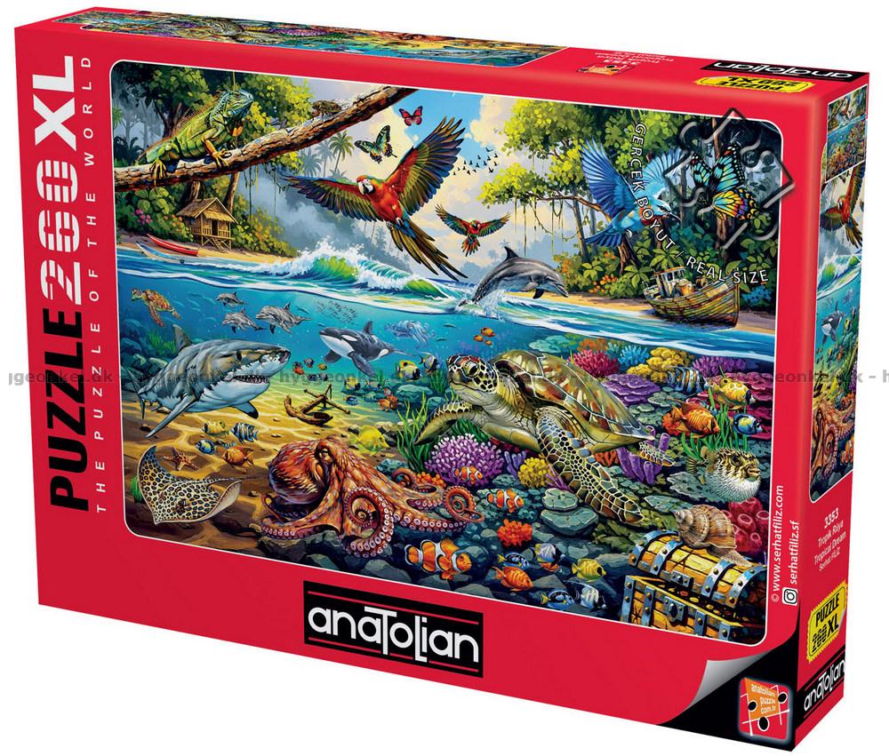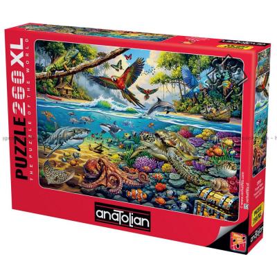- I luften flyver farverige papegøjer og sommerfugle. Under vandet er der et rigt dyreliv med en stor skildpadde, der svømmer blandt korallerne