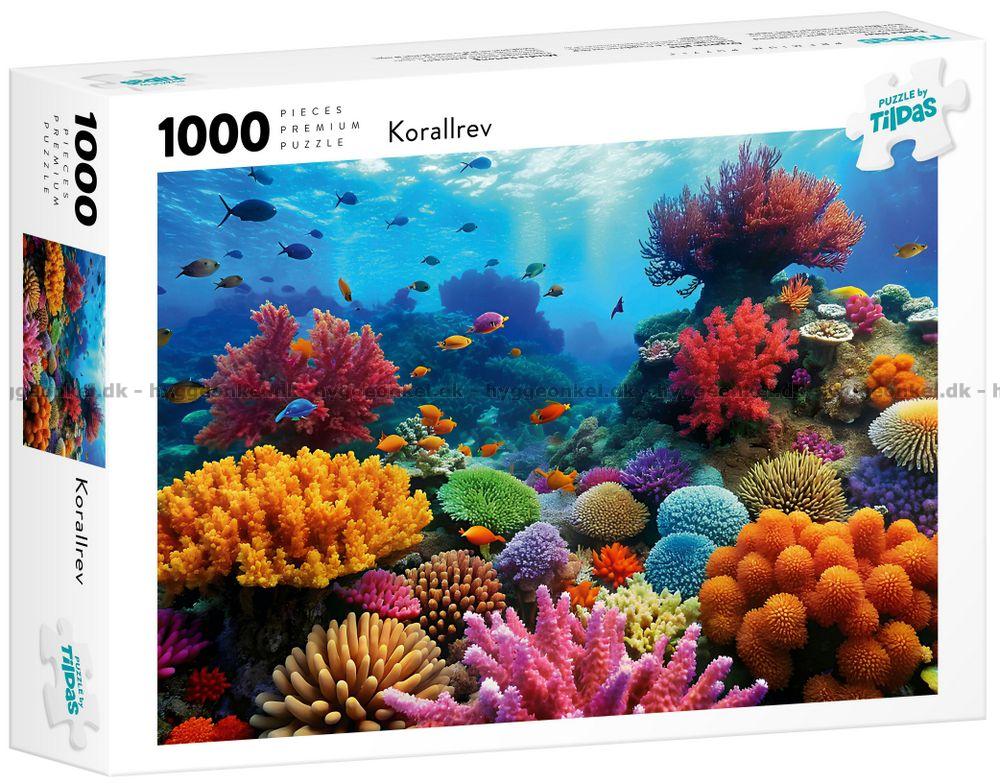 - Koralrevet er prydet med en rigdom af forskellige koraller i nuancer af rød, orange, gul, lilla og blå. Flere små fisk svømmer omkring korallerne
