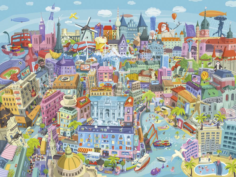 - Dette motiv er tegnet af Vidak. Puslespillet ligger i en trekantet æske og der medfølger en plakat af motivet