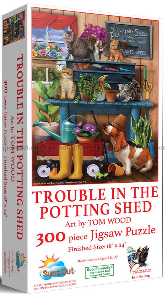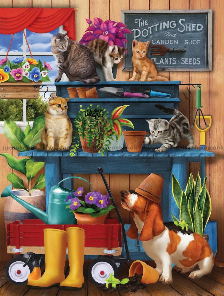 - I det hyggelige skur er der fyldt med liv og farver. Katte og hunden leger mellem blomster og haveredskaber