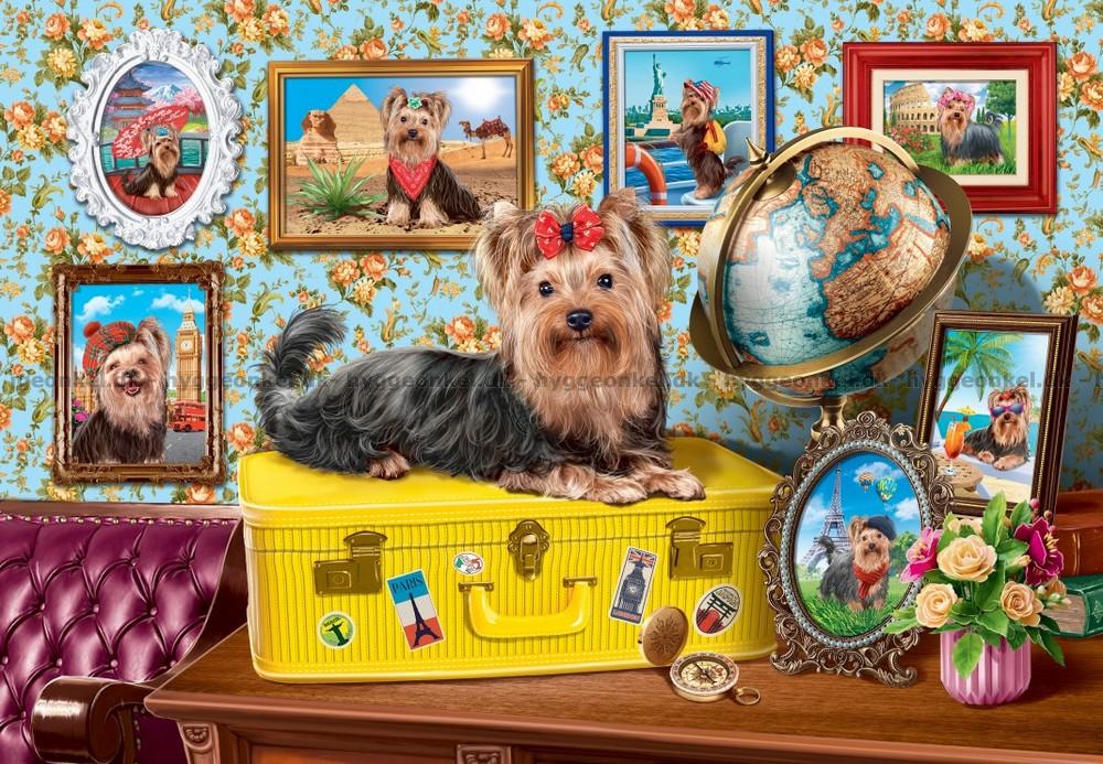 - Den charmerende Yorkshire terrier sidder på en gul kuffert, omgivet af rejseminder fra hele verden