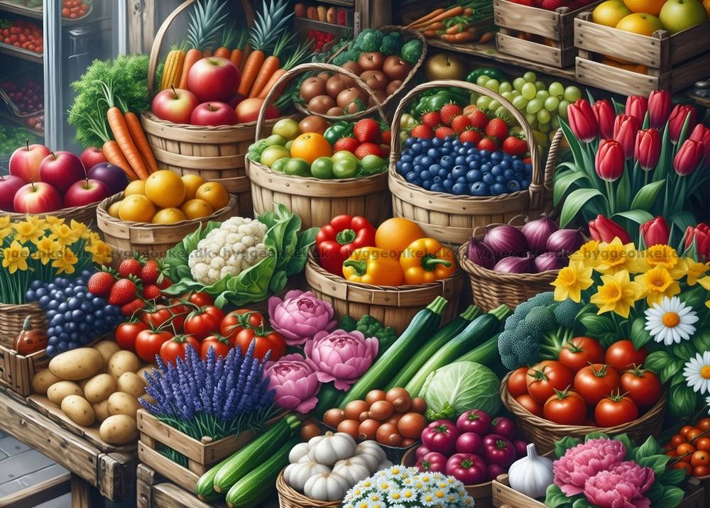- Boden er fyldt med friske frugter, grøntsager og blomster