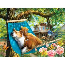 - Hundene ligger afslappet i høngekøjen i den hyggelige have
