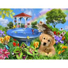 - Katten og hunden hygger sig ved fuglebadet. En række sommerfugle flyver rundt og lander på blomsterne