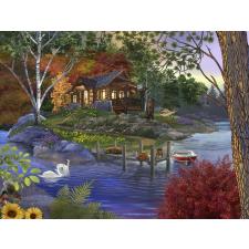 - En båd ligger fortøjet ved træbroen. Træerne omkring hytten er i smukke efterårsfarver