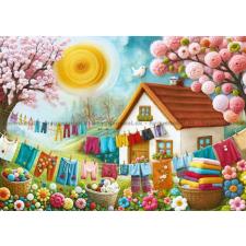 - Foran det lille hus hænger en lang tørresnor med kulørt vasketøj, der blafrer i solen