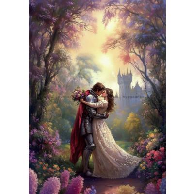 - Manden står i sin rustning, mens kvinden står i en hvid blondekjole. I baggrunden set det imponerede slot