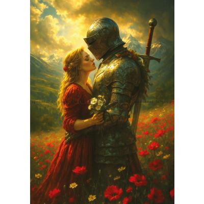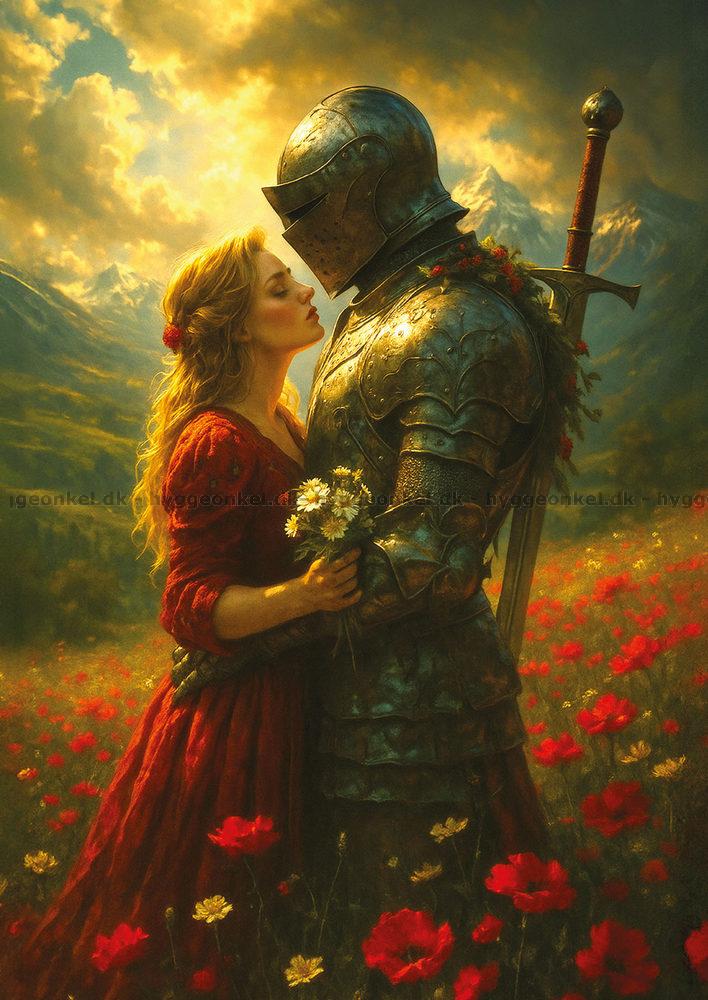 - Ridderen i skinnende rustning står tæt på kvinden i en rød kjole
