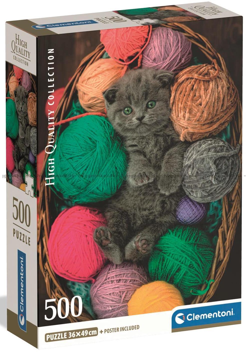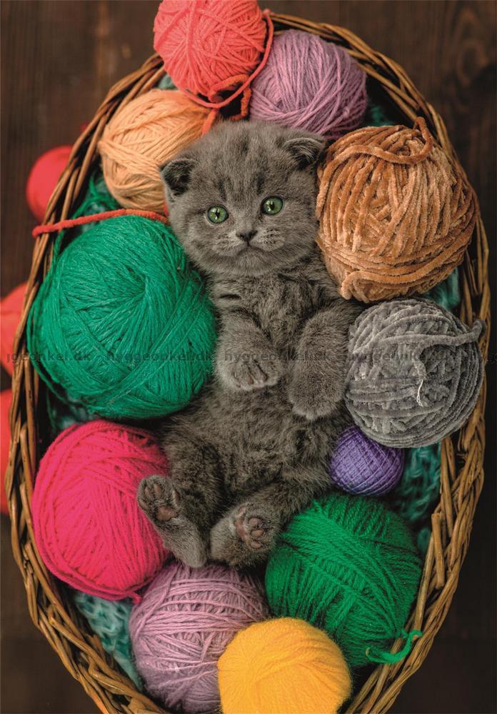 - Den grå killing ligger og kigger ud med sine grønne øjne