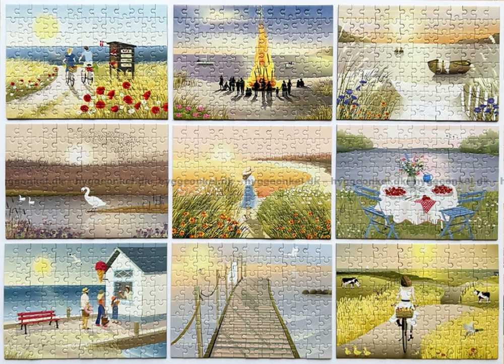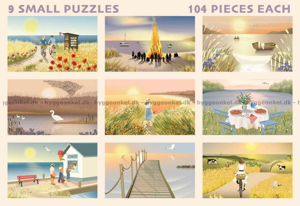 - Æsken består af 9 små puslespil hver på 104 brikker