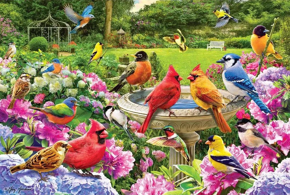 - De farverige fulge flokkes ved fuglebadet midt i den blomstrende have