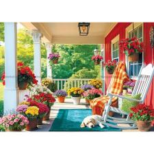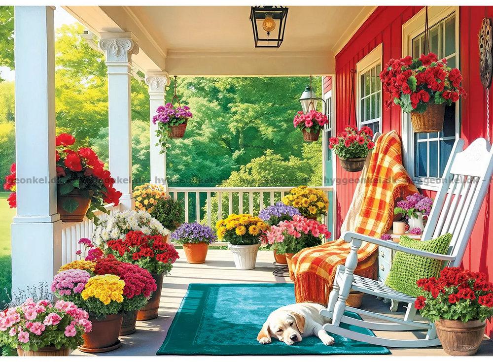 - Den hyggelige veranda er fyldt med blomster i alle regnbuens farver. En hund har fundet et godt sted at få en lur