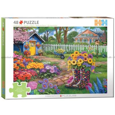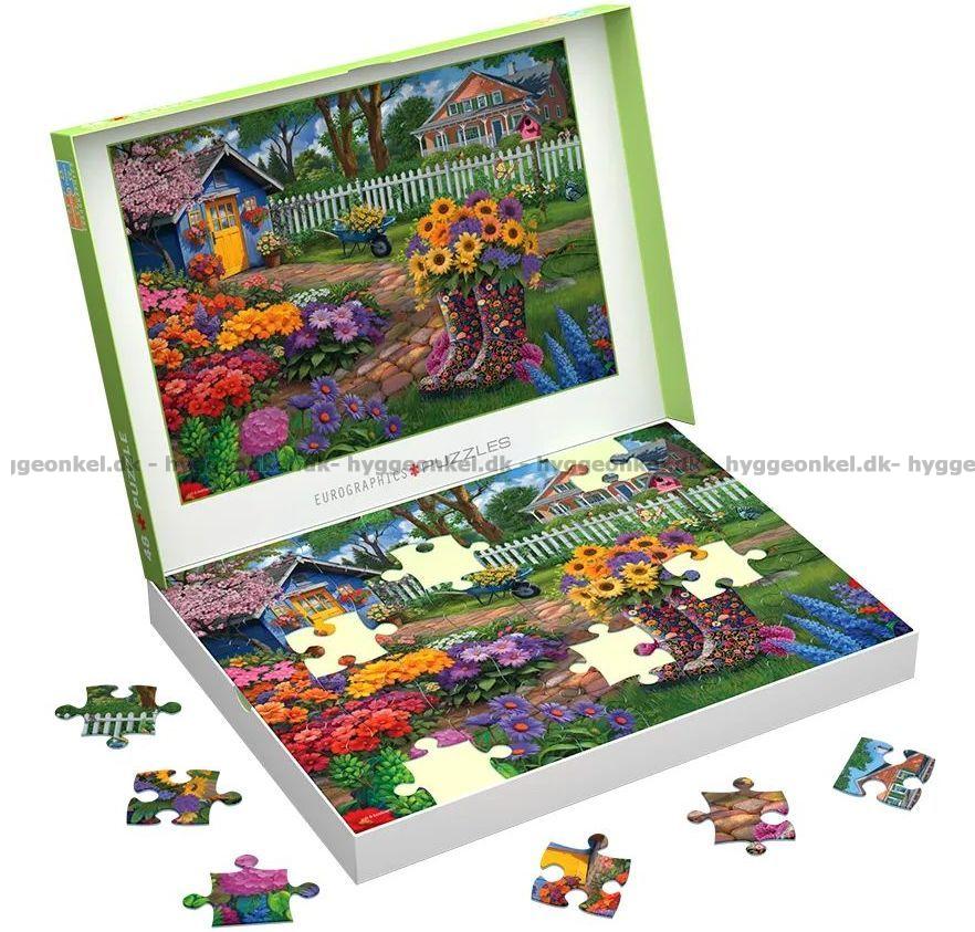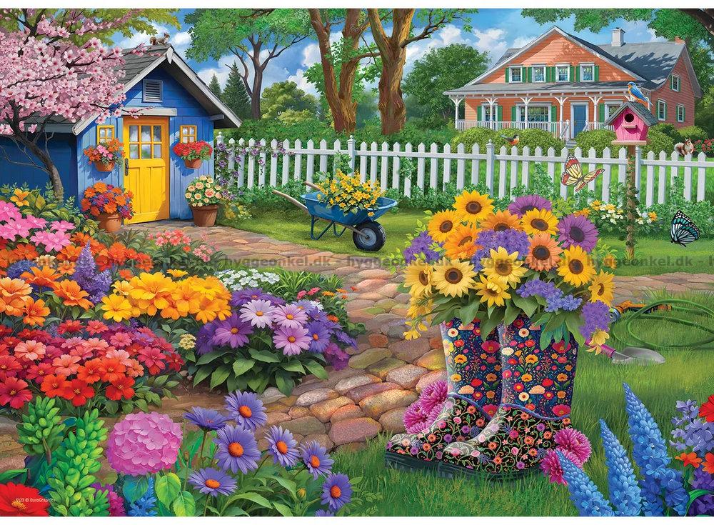 - Et par gummistøvler står midt i haven og bugner af solsikker. Rundt i haven er det bede fyldt med farverige blomster