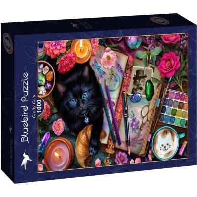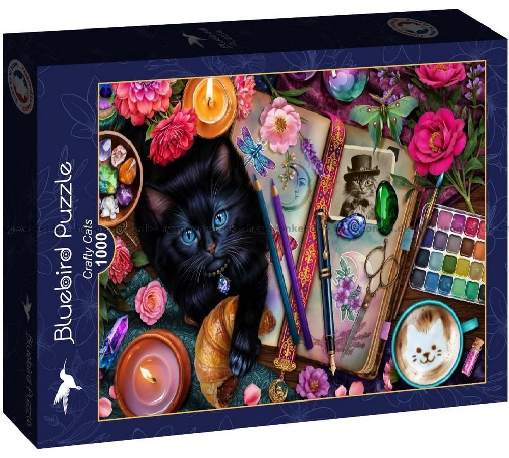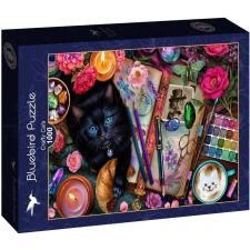 - Katten hviler sig midt på bordet, omgivet af blomster, farveblyanter, pensler og en åben notesbog med tegninger og et gammelt foto af en kat med høj hat
