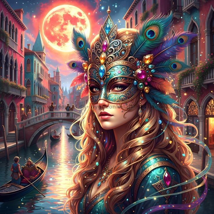 - Den unge kvinde står med en overdådig maske fyldt med farveige fjer og juveler. Bag hende ses en af byens mange kanaler