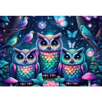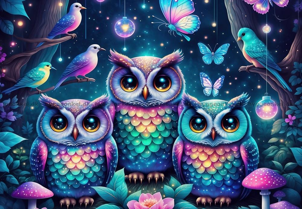 - Tre farvestrålende ugler med store, glitrende øjne sidder tæt sammen