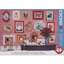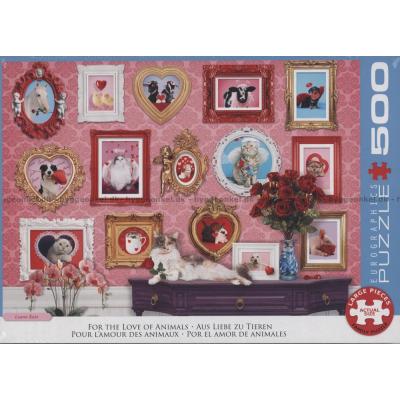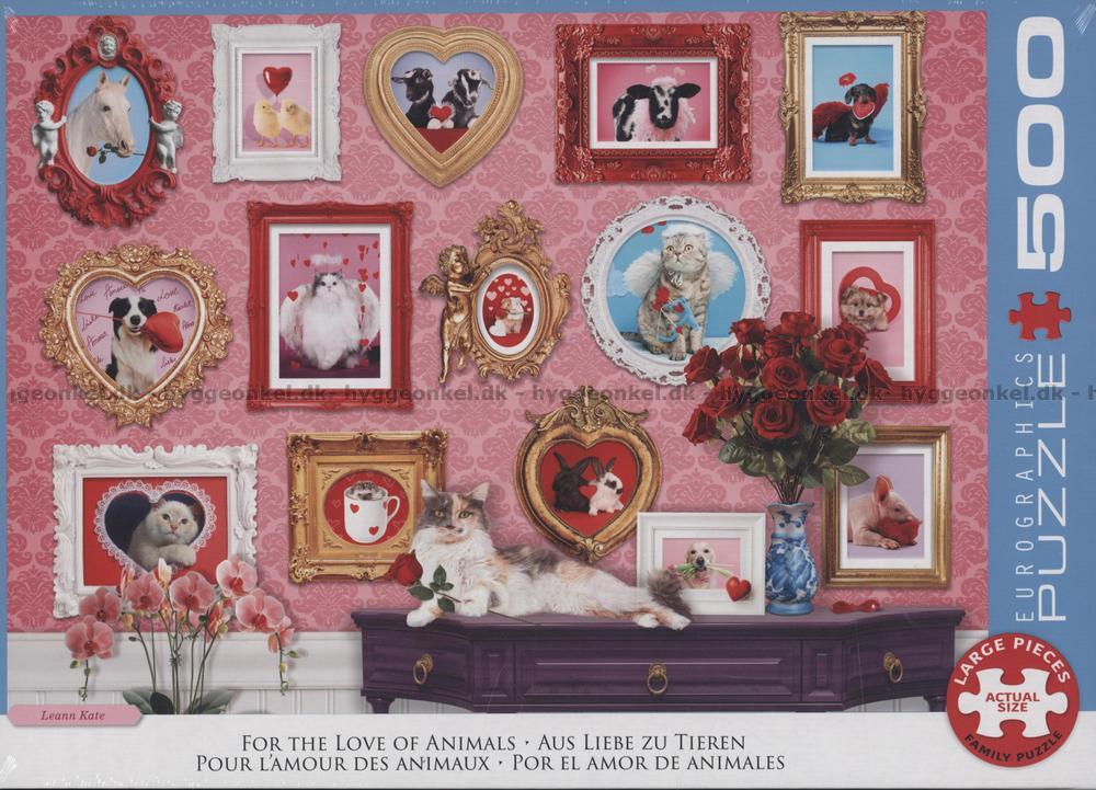 - På væggen hænger en lang række farverige billedrammer med herlige kæledyr