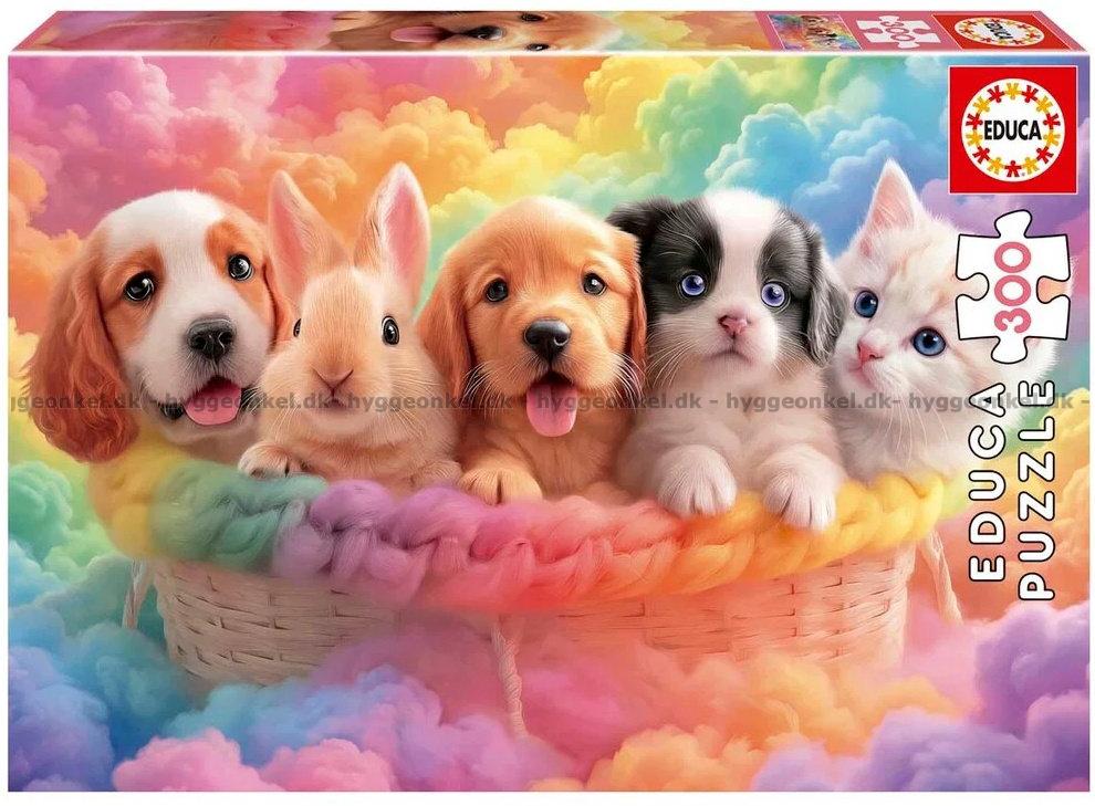 - Fem nuttede dyr sidder tæt sammen i en fletkurv omgivet af farverige skyer