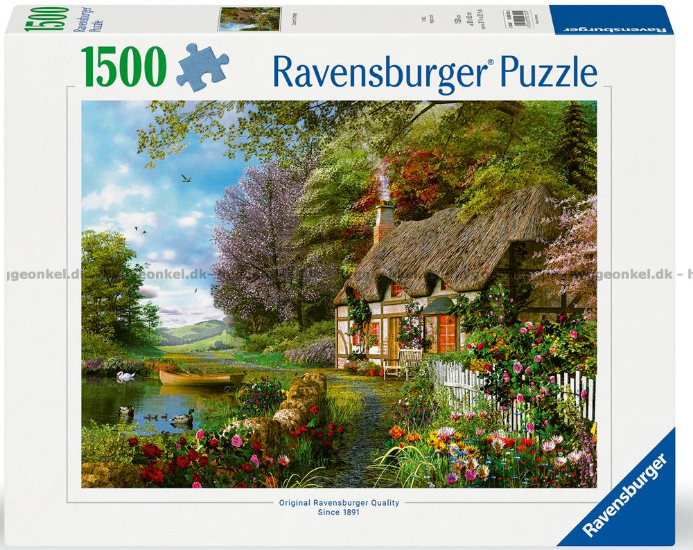 - Det stråtækte bindingsværk hus omgivet af farverige blomster og frodige træer