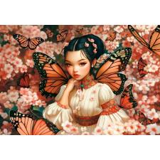 - Den unge kvinde med store, orange sommerfuglevinger sidder omgivet af blomstrende grene og svævende sommerfugle