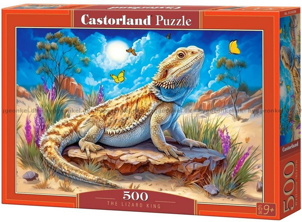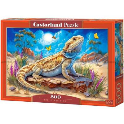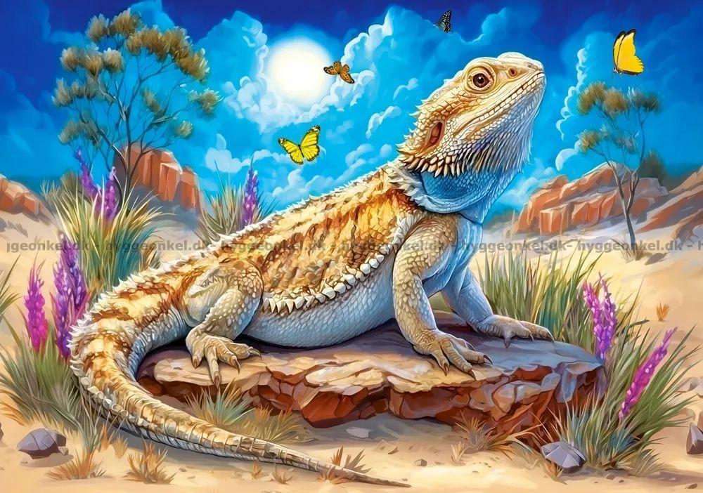 - Det store firben sidder majestætisk på en sten midt i det farverige ørkenlandskab