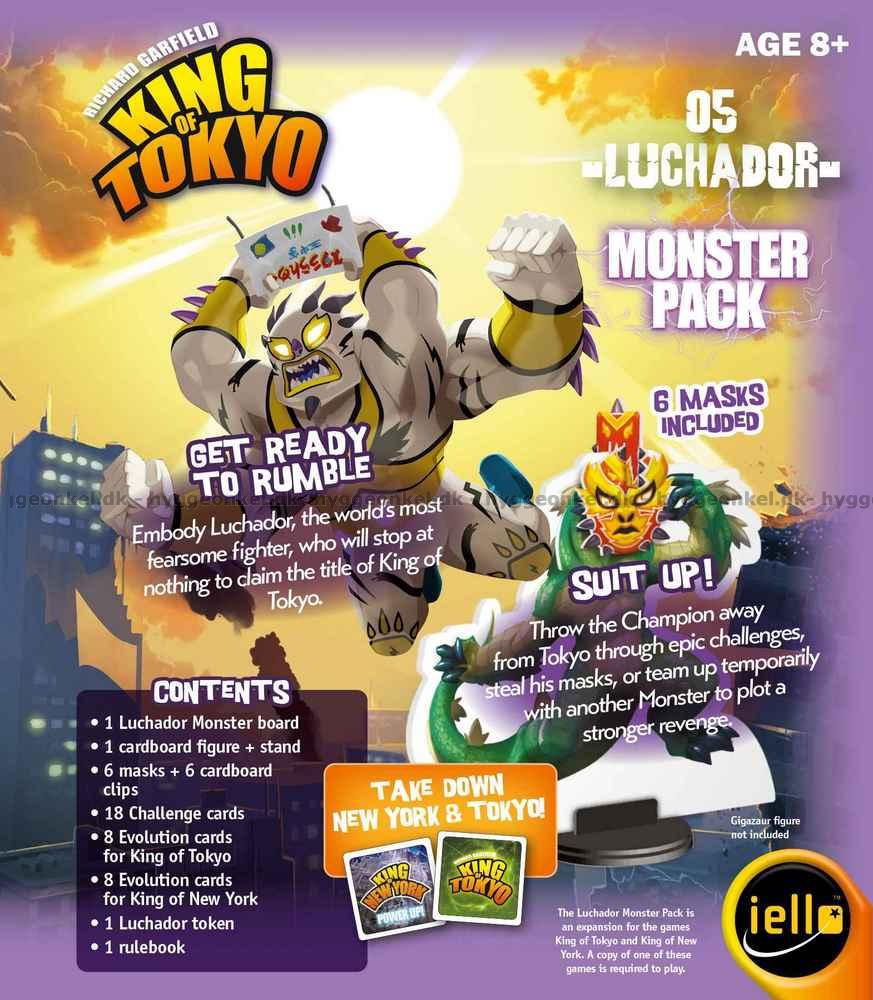 Gør dig klar til kamp i ringen med King of Tokyo: Luchador Monster Pack! Denne udvidelse til King of Tokyo bringer nye måder at kæmpe, samarbejde og vinde på. Luchador, verdens mest frygtindgydende bryder, træder ind i arenaen med ét mål for øje – at blive den ubestridte King of Tokyo.