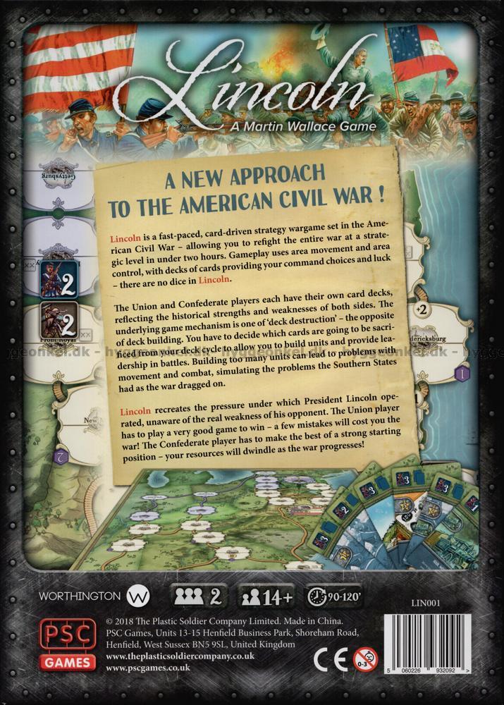 Lincoln er et hurtigt, kortdrevet strategisk krigsspil for to spillere, der genskaber den Amerikanske Borgerkrig på under to timer!