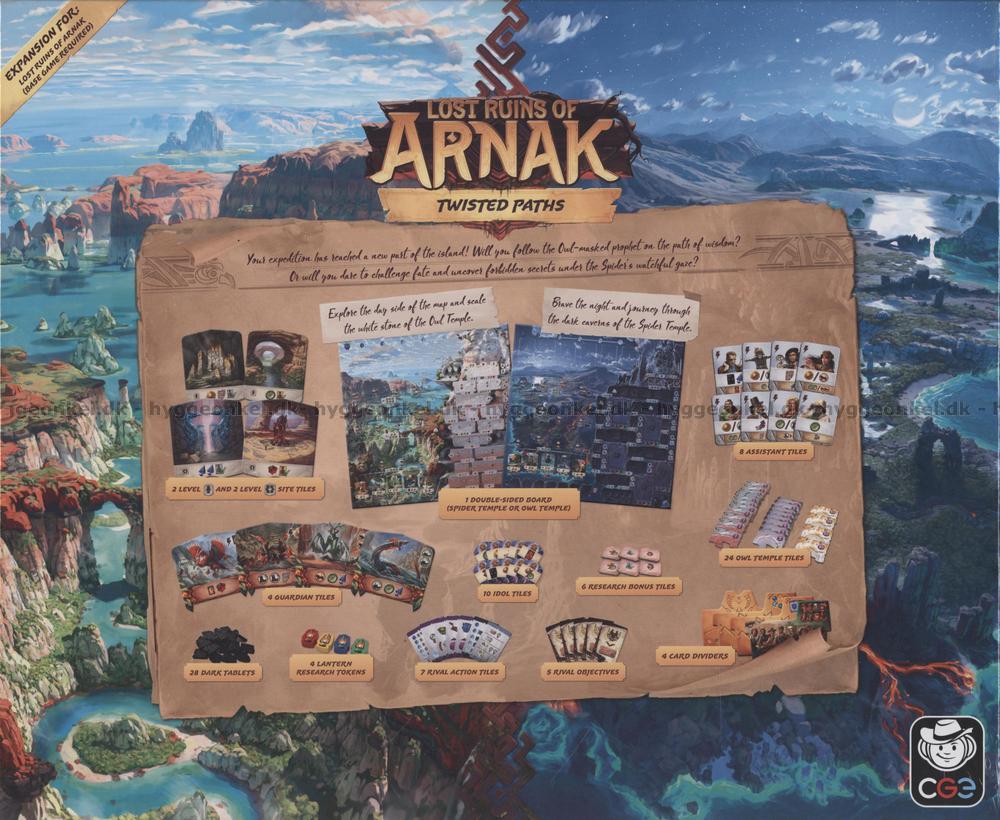 Med denne udvidelse får du en dobbeltsiddet spilleplade, der fører dig til enten Edderkoppetemplet eller Ugletemplet – hver med sine helt særlige mekanikker og stemning. I Edderkoppetemplet introduceres mørke tavler, en sjælden ressource der giver adgang til at påkalde altere og bruge artefakter på kraftfulde måder, men de kan koste dig dyrt i point, når spillet er slut.