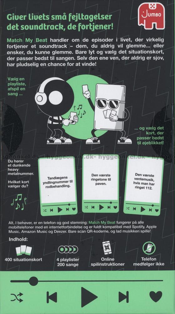 Match My Beat er et underholdende spil, hvor musik og hverdagens skæve øjeblikke smelter sammen. Med blot en telefon og en god portion humor åbner spillet op for en verden, hvor velkendte sange pludselig får helt nye betydninger, og hvor små, genkendelige situationer fra livet bliver sat i scene med det helt rigtige soundtrack.