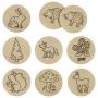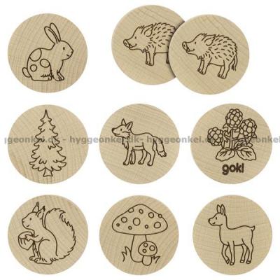 I dette lille spil får du 16 runde træbrikker med ting fra skoven. Der er altså i alt 8 par, der skal matches.