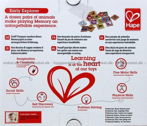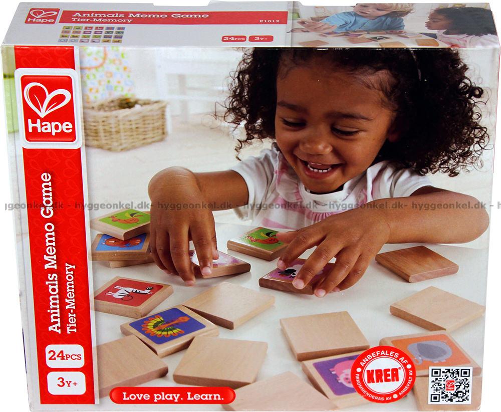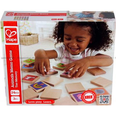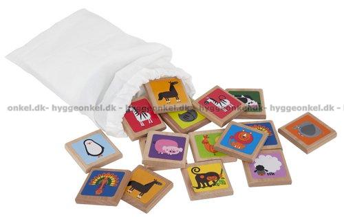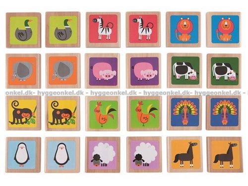 24 træbrikker med dyr på. Brikkerne passer sammen 2 og 2. Hver brik måler 5 x 5 x 0,8 cm., så der er tale om god og holdbar kvalitet.