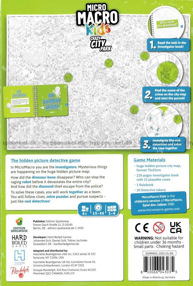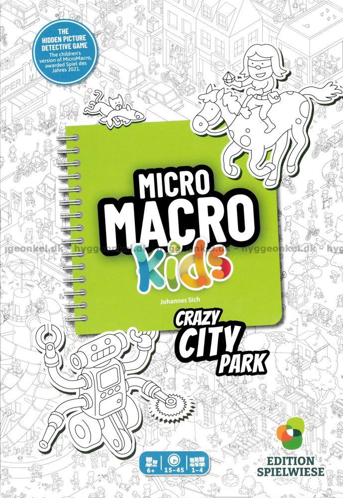 I MicroMacro: Kids – Crazy City Park bliver I ægte små detektiver i en farverig og livlig by fuld af sjove mysterier. På det store kort over Crazy City Park myldrer det med liv, og overalt gemmer der sig små historier, mærkelige hændelser og gådefulde spor. Jeres opgave er at løse 22 spændende sager ved at kigge nøje på kortet, finde sammenhænge og afsløre, hvad der egentlig er sket.