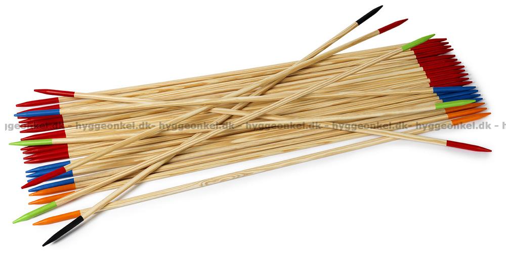 I denne udgave er pindene vokset, så spillet egner sig til at spille på gulvet eller i haven - men vær dog opmærksom på, at når der er tale om store pinde, så kan det være lidt hård ved gulvet, hvis ikke man passer på.