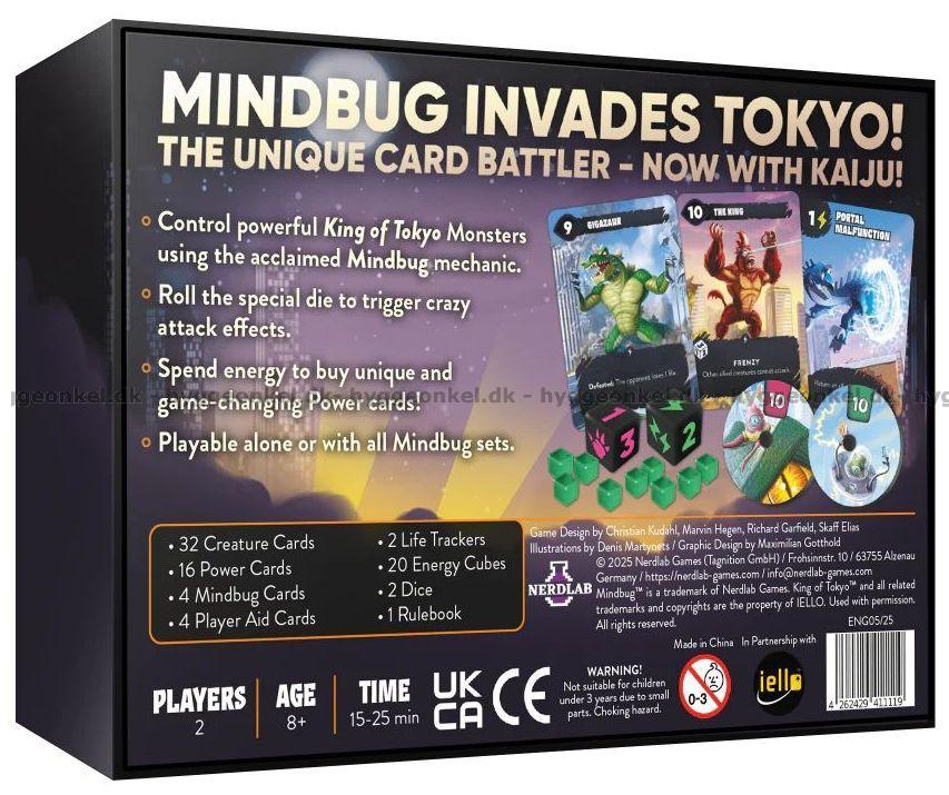 King of Tokyo møder Mindbug. I dette selvstændige spil overtager du kontrollen med ikoniske monstre og kaster dig ud i taktiske kampe fyldt med overraskelser. Med et særligt terningeslag kan du udløse vilde angrebseffekter, mens energi bruges strategisk til at erhverve unikke power cards, der kan vende hele kampen på et øjeblik.