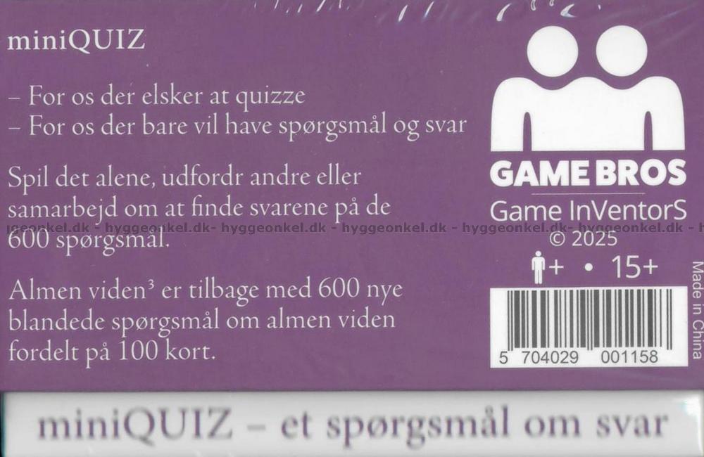 MiniQuiz: Almen viden 3 er et underholdende quizspil i det populære MiniQuiz-format, der er skabt til alle, som elsker at teste deres paratviden på en sjov og uformel måde. Spillet indeholder 600 spørgsmål inden for almen viden, så der er rig mulighed for både at blive udfordret og overrasket. Med sit kompakte og praktiske design er det nemt at tage med på farten – perfekt til hyggelige aftener med familien, en tur på ferie eller som sjov underholdning i vennekredsen.