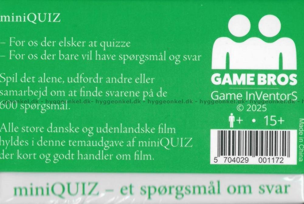 Spillet er designet i et kompakt og praktisk format, som gør det nemt at tage med på farten – lige meget om du skal til en hyggelig aften med vennerne, på ferie eller bare vil have lidt sjov mellem filmene. MiniQuiz: Film kan spilles på mange forskellige måder, hvilket gør det let at tilpasse spillet til stemningen og selskabet. Uanset hvordan du vælger at spille, byder denne grønne udgave på timevis af underholdning, grin og nostalgiske filmøjeblikke.